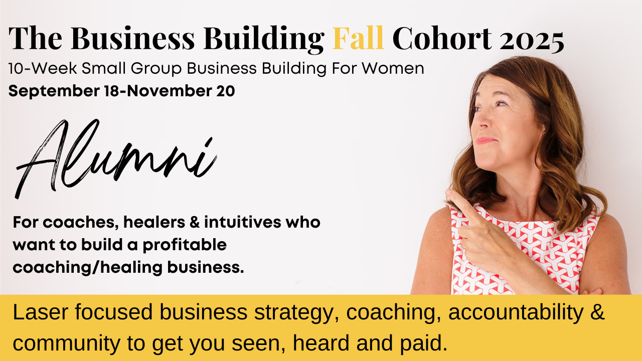 The live coaching calls meet every Thursday 1:00-2:30 pm ET starting Sept. 18. These calls will be a strategic mix of setting your goal, creating your business strategy, creating and implementing your action steps, tweaking when necessary combined with inner work coaching to bust through any resistance to being seen, heard and paid.